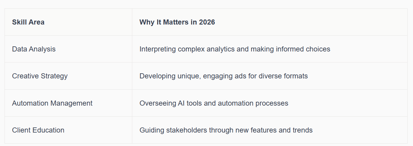 The rise of Performance Max campaigns has pushed consultants to adapt quickly. These campaigns leverage AI to optimise across all Google channels, requiring a consultant who can interpret performance data and refine strategies in real time. Here’s a snapshot of the essential skills for 2026: